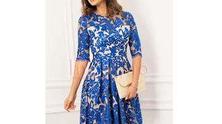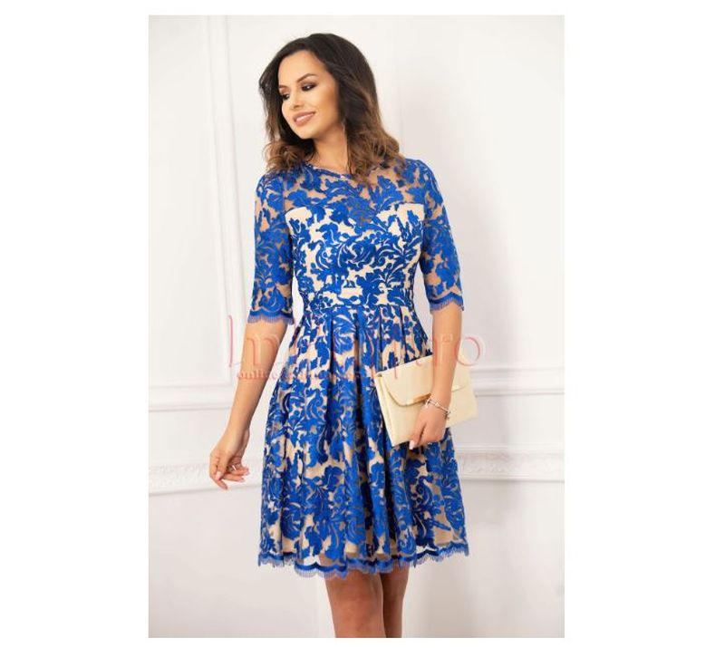 Prima este o Rochie de ocazie bej cu dantela albastra. Aceasta rochie se potriveste perfect unui eveniment de primavara sau de vara si poate fi asortata extrem de usor. Dantela albastra de deasupra arata superb si ii confera rochiei o eleganta aparte.