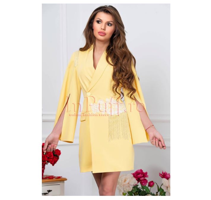 Urmatoarea este o Rochie de seara galbena scurta tip sacou. Rochiile tip sacou au devenit foarte populare in ultimii ani si nu este de mirare avand in vedere ca arata fenomenal. Iar daca adaugam si maneci despicate, dar si franjuri, rezultatul este unul de efect.