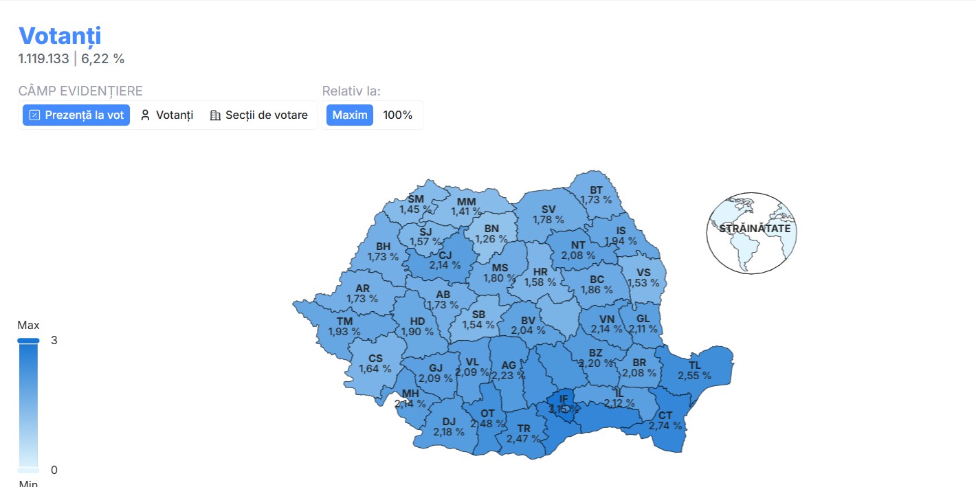 Pe parcursul zilei, Autoritatea Electorală Permanentă publică date actualizate despre prezența la urne. Poți urmări în timp real participarea la vot pe site-ul oficial prezenta.roaep.ro, unde sunt afișate: