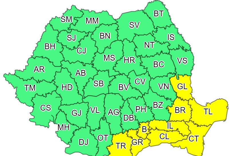 Codul GALBEN emis de autorități intră în vigoare marți seara la ora 23 și se prelungește pe tot parcursul zilei de miercuri, până la ora 23.00.