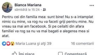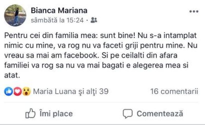 Când autoritățile s-au mobilizat și au început căutările pe contul personal de facebook al Biancăi a apărut un mesaj: „Pentru cei din familia mea: sunt bine! Nu s-a întâmplat nimic cu mine, vă rog nu vă faceți griji pentru mine. Nu vreau să mai am facebook. Și pe ceilalți din afara familiei vă rog să nu vă mai băgați e alegerea mea și atât!”.