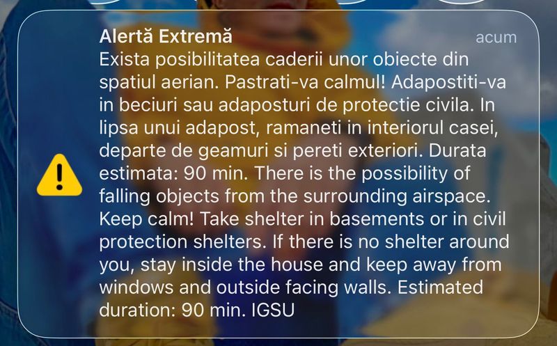 ”În urmă cu scurt timp a fost emis un mesaj RO-Alert de către Inspectoratul General pentru Situații de Urgență pentru zona de nord a județului prin care locuitorii sunt informați despre faptul că există posibilitatea căderii unor obiecte din spațiul aerian. Mesajul este unul de informare și avertizare, iar populația este rugată să urmeze recomandările transmise dacă situația o impune și să apeleze numărul unic de urgență 112 dacă observă obiecte care cad din cer și pun în pericol bunurile materiale și integritatea personală”, transmit autoritățile.