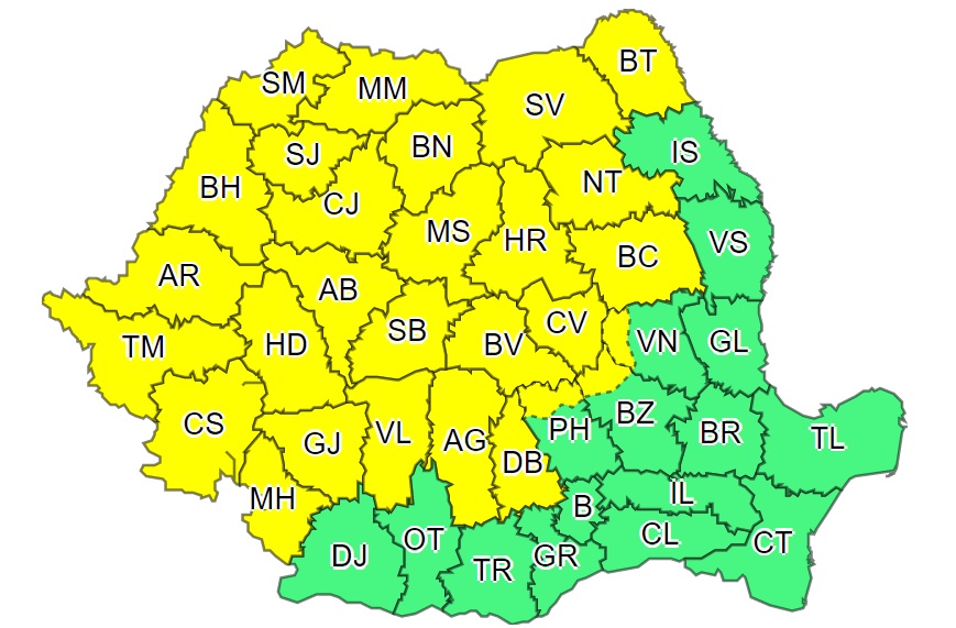 Meteorologii de la ANM au emis, joi dimineață, o nouă avertizare COD GALBEN pentru 28 de județe, valabilă de-a lungul întregii zile. Vor fi perioade cu instabilitate atmosferică accentuată, ce se va manifesta prin averse torențiale, descărcări electrice, intensificări de scurtă durată ale vântului, vijelii și grindină, spun specialiștii meteo.