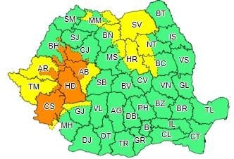De asemenea, în acelaşi interval va fi Cod portocaliu de ploi abundente, în judeţele Bihor, Cluj, Alba, Arad, Hunedoara, Caraş-Severin şi Timiş.