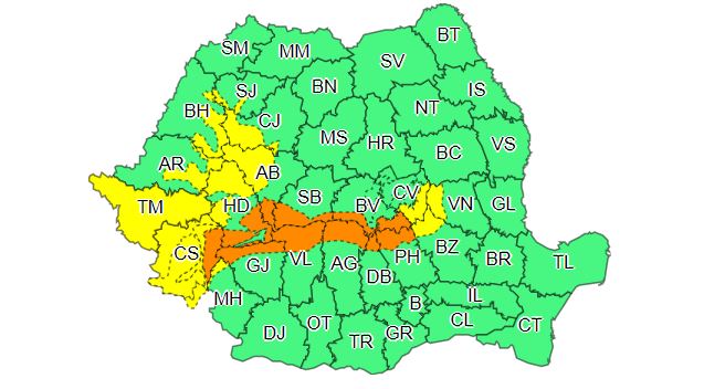 De asemenea, în acelaşi interval, va fi cod portocaliu de intensificări susţinute ale vântului, viscol puternic şi vizibilitate redusă în Carpaţii Meridionali, la altitudini de peste 1800 m.