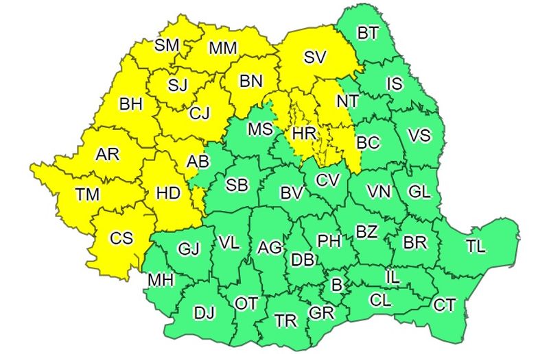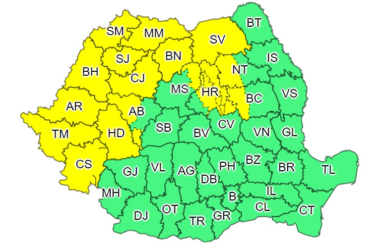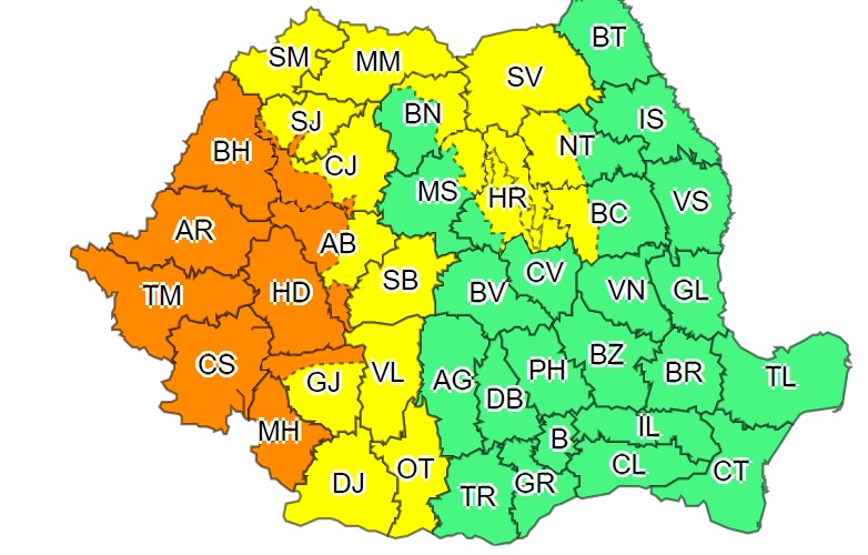 Avertizarea de cod portocaliu cuprinde Banatul, Crișana, vestul Transilvaniei și al Olteniei. În aceste zone din România vor fi averse torențiale, descărcări electrice, vijelii și grindină.