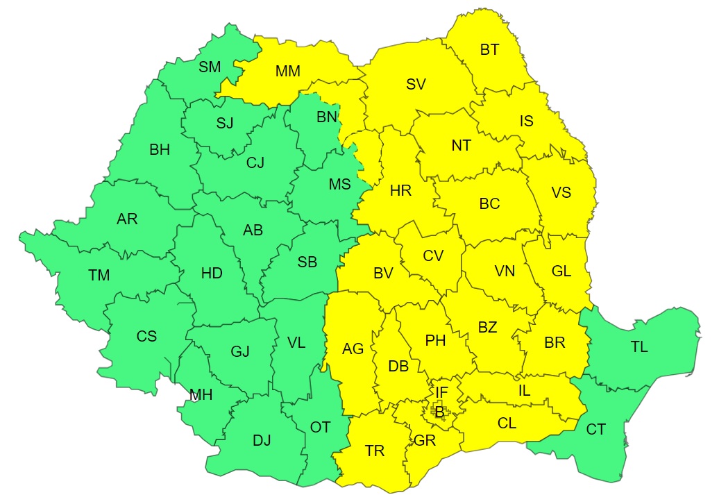 Atenţionarea Cod galben vizează municipiul Bucureşti şi judeţele Argeş, Bacău, Bistriţa-Năsăud, Brăila, Botoşani, Braşov, Buzău, Călăraşi, Covasna, Dâmboviţa, Galaţi, Giurgiu, Harghita, Ilfov, Ialomiţa, Iaşi, Maramureş, Mureş, Neamţ, Prahova, Suceava, Teleorman, Vrancea şi Vaslui.