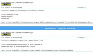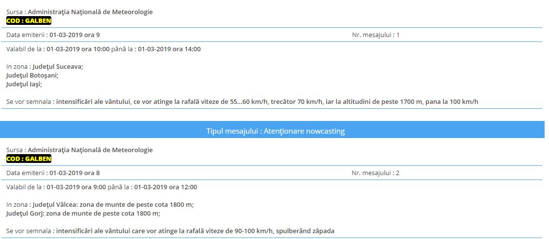 Până la ora 14:00 este în vigoare cod galben de vânt, ce va atingela rafală viteze de 55...60 km/h, trecător 70 km/h, iar la altitudini de peste 1700 m, pana la 100 km/h. Codul vizează județele: Suceava, Botoșani și Iași.