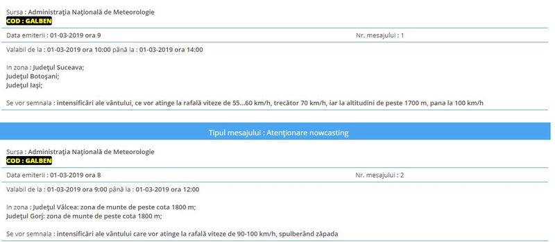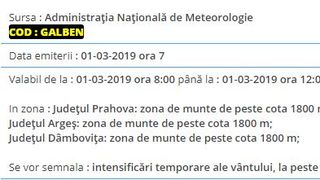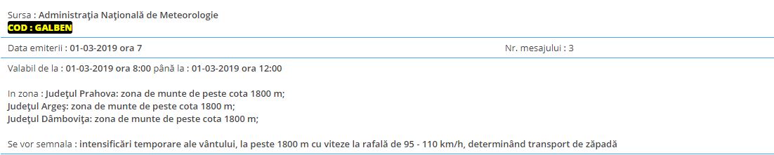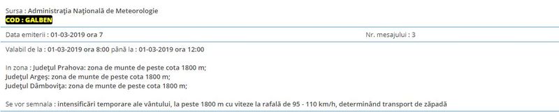 Un alt cod galben este în vigoare până la ora 12:00. În acest interval se vor semnala intensificări temporare ale vântului, la peste 1800 m cu viteze la rafală de 95- 110 km/h, determinând transport de zăpadă. Codul galben vizează județele: Prahova: zona de munte de peste cota 1800 m, Argeş: zona de munte de peste cota 1800 m, Dâmboviţa: zona de munte de peste cota 1800 m.
