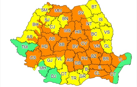 Administraţia Naţională de Meteorologie (ANM) e emis o avertizare Cod portocaliu valabilă joi, între orele 10.00 şi 23.00, când în zonele montane, precum şi local în Muntenia, Dobrogea, Transilvania, Maramureş şi în sudul Moldovei, vor fi perioade cu averse torenţiale şi se vor acumula cantităţi de apă de peste 40 l/mp şi pe arii restrânse 50...80
