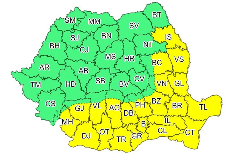 Interval de valabilitate: vineri (31 iulie). Fenomene vizate: caniculă, disconfort termic accentuat. În cursul zilei de vineri (31 iulie), în cea mai mare parte a Olteniei, Munteniei și Dobrogei va fi caniculă, iar temperaturile maxime vor fi de 35...37 de grade.