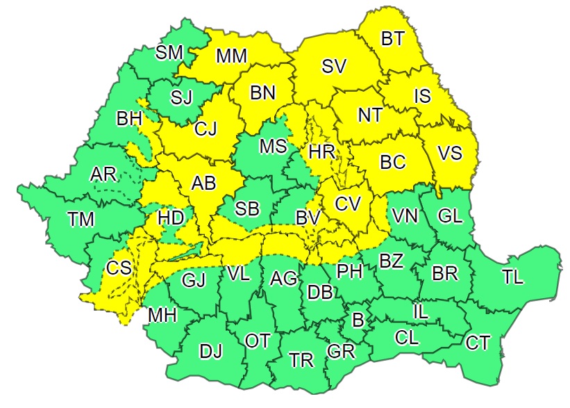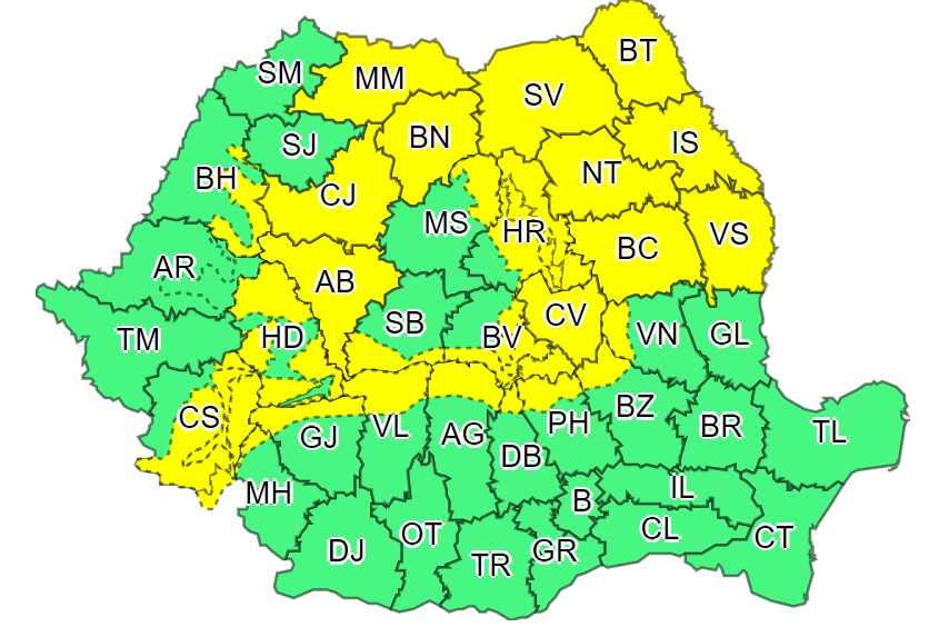 Interval de valabilitate: 30 iulie, ora 12:00 – 31 iulie, ora 02:00. Fenomene vizate: instabilitate atmosferică temporar accentuată. În intervalul menționat la munte, în nordul, nord-estul și local în centrul țării vor fi intervale cu instabilitate atmosferică accentuată ce se va manifesta prin intensificări ale vântului, vijelii, averse ce vor avea și caracter torențial, descărcări electrice și izolat grindină.
