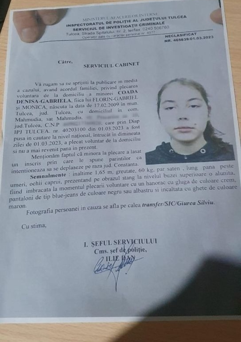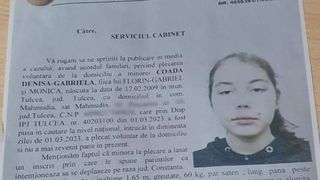 O minoră a dispărut de acasă în urmă cu 3 zile, la data de 1 martie 2023 și nu a mai revenit până în prezent. Înainte de a pleca, ea a lăsat o mică scrisoare pentru familia ei.