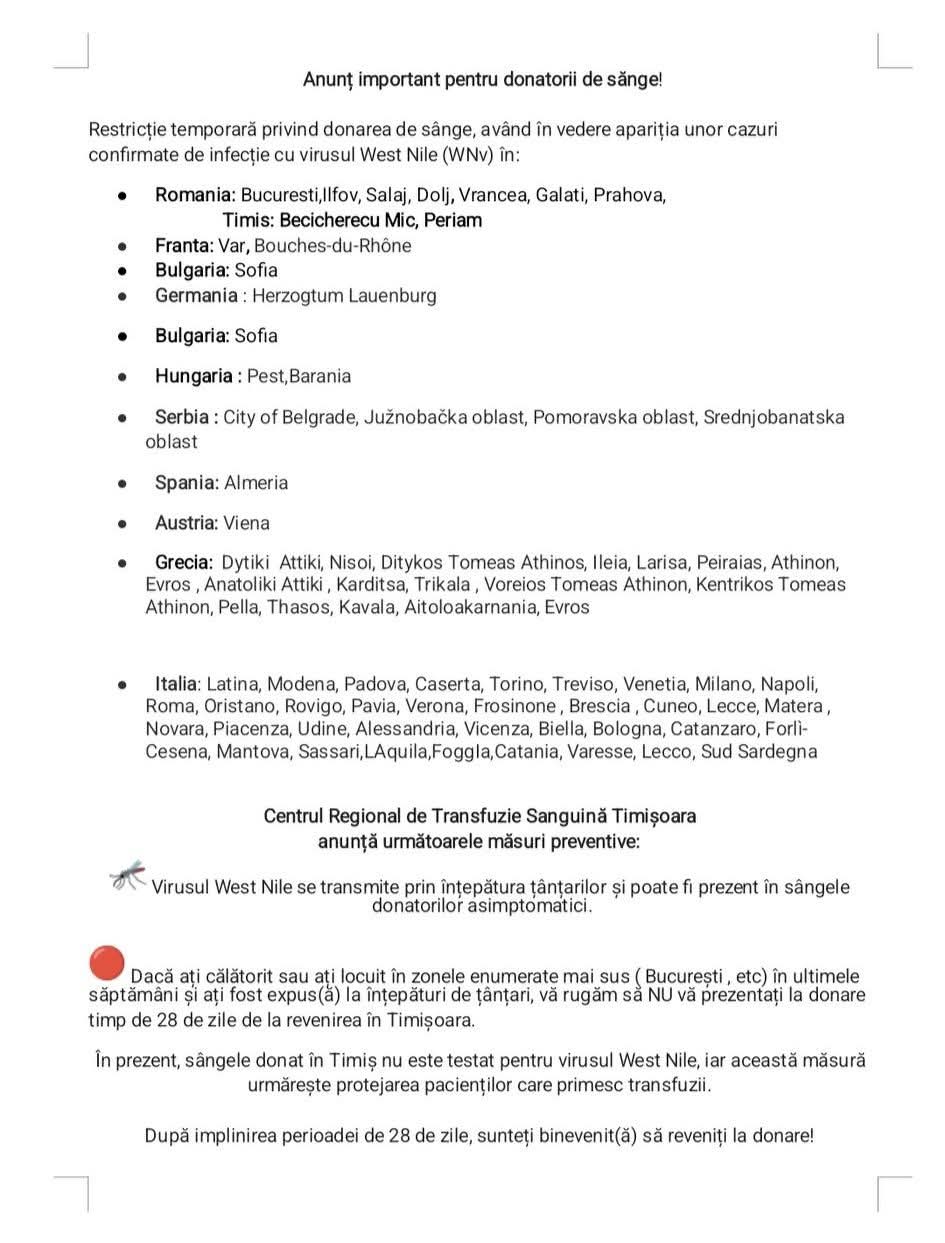 Cei care locuiesc în aceste localități sunt amanați temporar de la donare până în data de 30 octombrie 2025.”, este mesajul postat pe pagina de Facebook a Centrului Regional de Transfuzie Sanguină Timișoara.