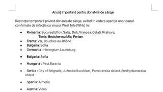 Centrul Regional de Transfuzie Sanguină Timișoara a anunțat o restricție temporară privind donarea de sânge în anumite zone, ca urmare a apariției unor cazuri confirmate de infecție cu virusul West Nile. Măsura este valabilă până la 30 octombrie 2025 și vizează persoanele care locuiesc sau au călătorit recent în regiunile afectate din România și din alte țări europene, după cum urmează.