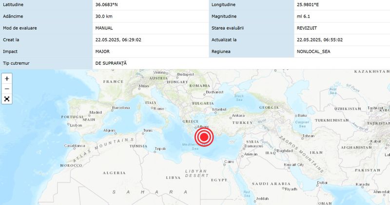 Seismul din Creta a avut loc la ora 6,19 (ora locală), potrivit INFP.ro.