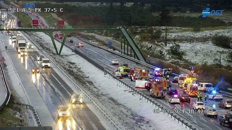 Potrivit Infobae.es, vremea rea a provocat mai multe accidente în zona respectivă. Cel mai grav s-a produs la ora 17.27 la kilometrul 37 al A-5 spre Madrid din cauza grindinei căzute în zonă, care a provocat o ciocnire în lanț a zece vehicule.