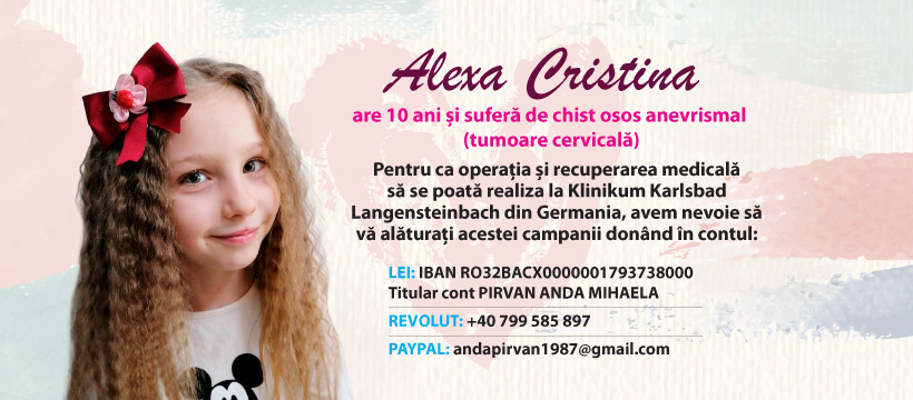 „Va salut cu mare respect, ma numesc Pirvan Marian iar Fetita mea de 10 ani Pirvan Alexa, a fost diagnosticată acum 10 zile cu un CHIST OSOS ANEVRISMAL- o tumoare (din fericire nu este canceroasă) la coloana vertebrală cervicală (vertebra 5). Aceasta a pornit dintre vertebre și a inconjurat coloana- deja apasă pe măduvă existând risc de paralizie. După două săptămâni prin spitalele din București, medicii ne-au îndrumat către Mannheim University Hospital din Germania- nu se poate opera/ recupera în țară.Familia