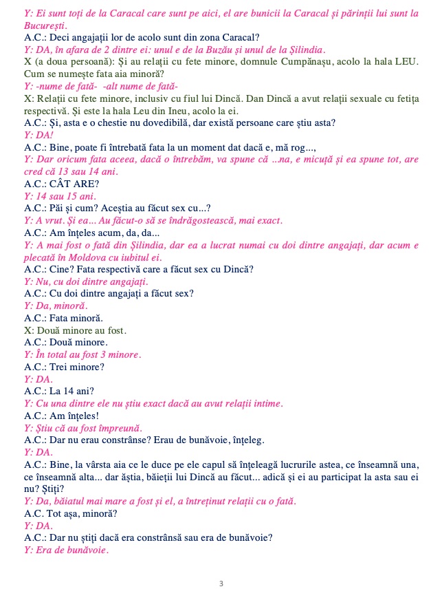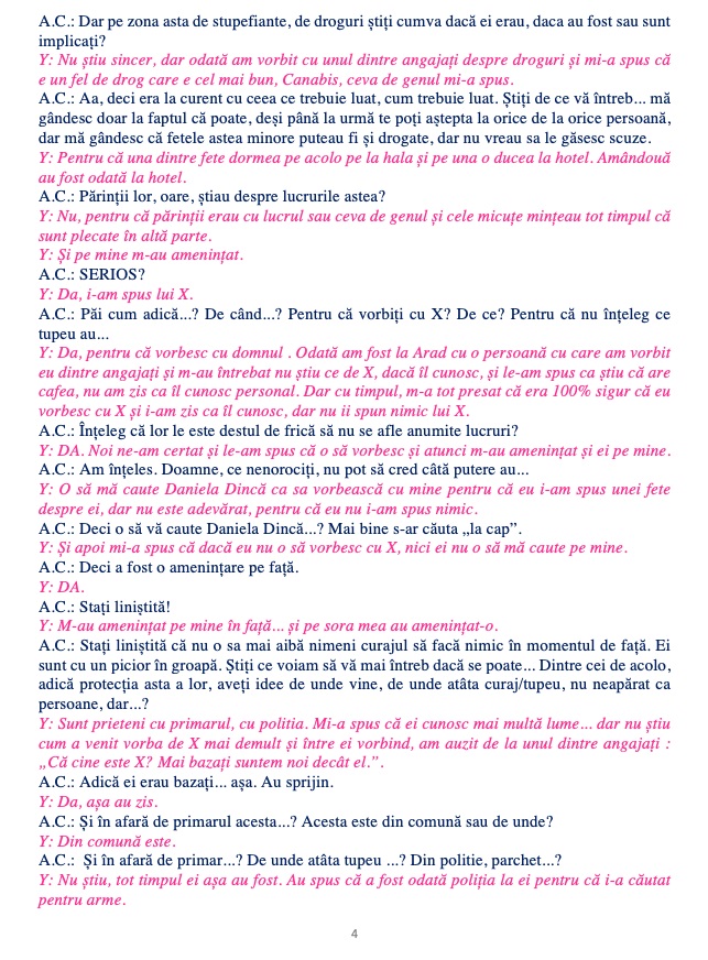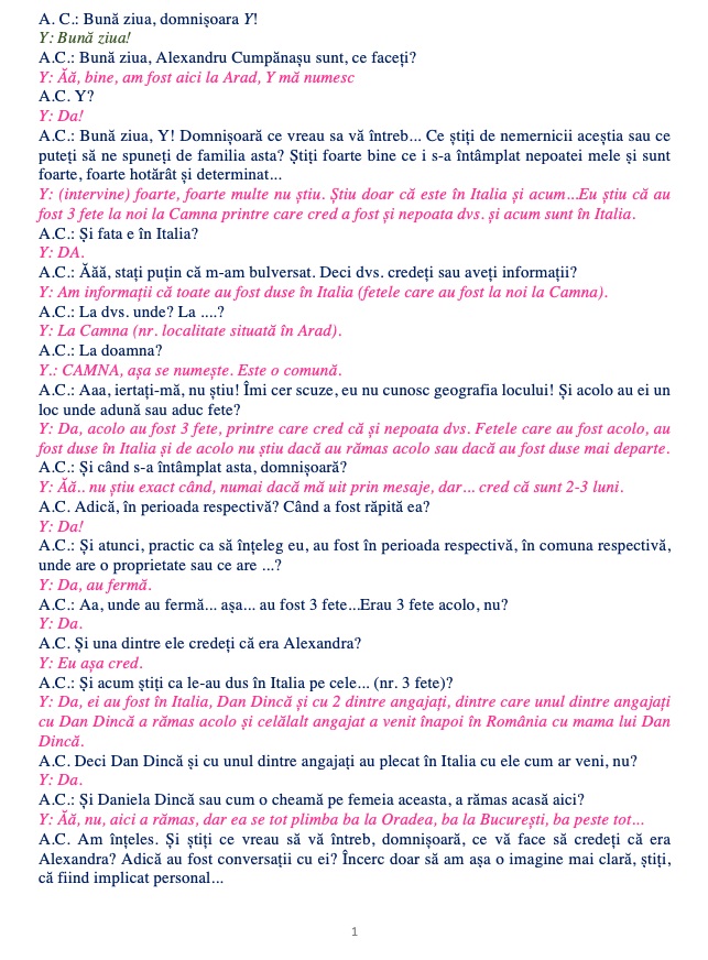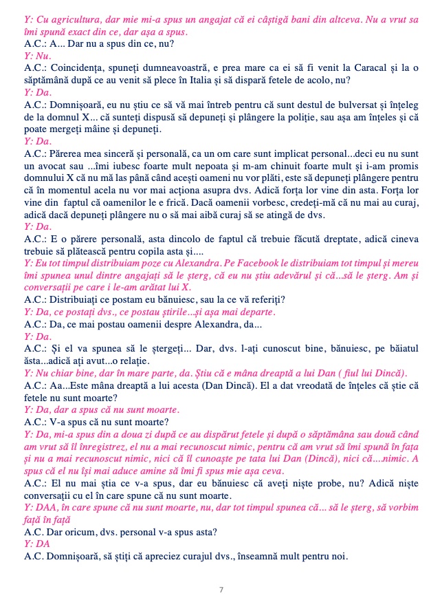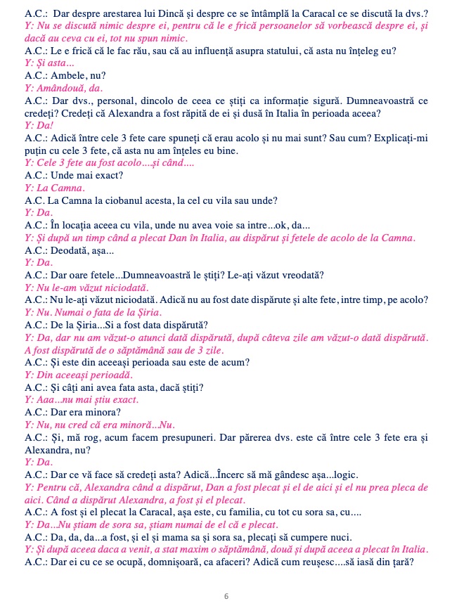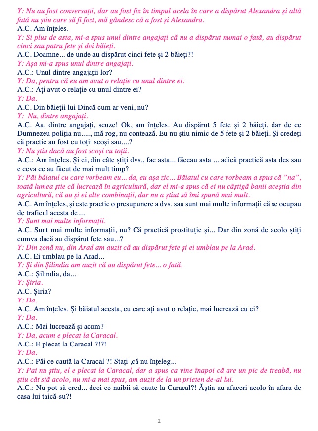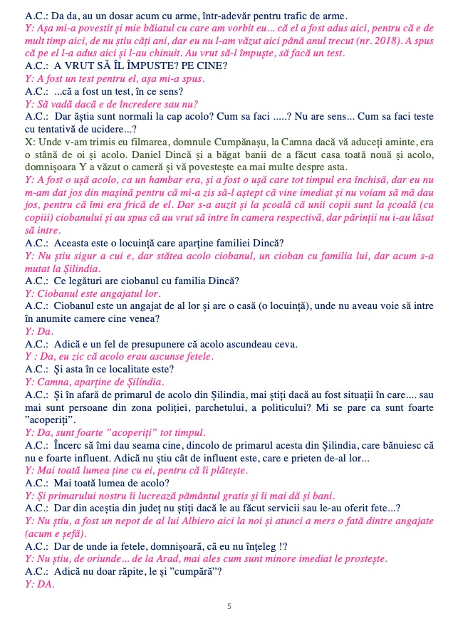 Stenograma discuției cu martora aflată în anturajul familiei Dincă o regăsiți în fotografiile mai jos prezentate. Cuprinde informații despre: mărturia unui angajat al lui Dincă cum că fetele erau în viață la câteva zile după răpirea Alexandrei, relația CLANULUI Dincă cu un primar din Arad și politie, detalii despre folosirea de către aceștia de fete minore, cu vârsta cuprinsă între 13-14 ani pentru servicii sexuale împreună cu angajații și nepotul lui Albiero, amenințările familiei Dincă la adresa martorei, LOCAȚIA unde au fost sechestrate 3 fete (conform declarației martorei, una dintre ele ar fi fost Alexandra), traficul cu fete