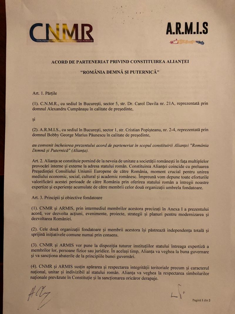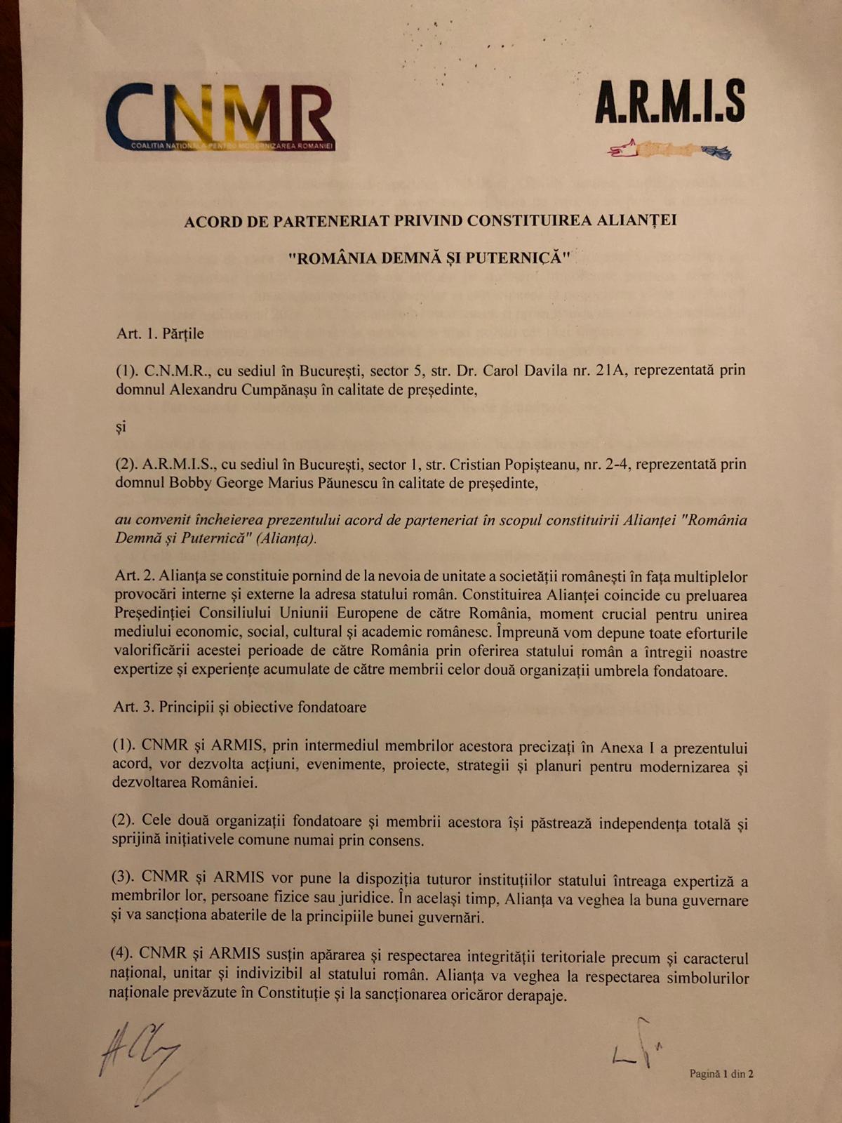 În cadrul unei ceremonii oficiale Alexandru Cumpănaşu. în calitate de Preşedinte CNMR si Bobby Păunescu în calitate de Preşedinte ARMIS au semnat Acordul de Colaborare pentru înfiinţarea Alianţei "Romania Demna si Puternica".