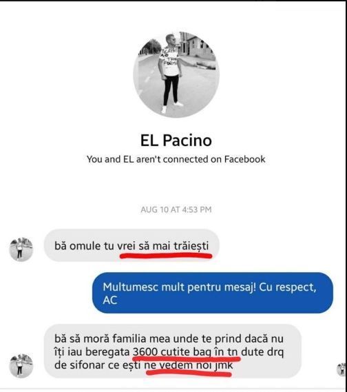 “Aceasta amenințare, pe care o atribui clanului Duduianu, nu mai are nevoie de nicio explicație, nici măcar pentru MAI‼ O fac publică pentru ca dumneavoastră sa vedeți cât de dură este această luptă și pentru că, dacă se va întâmpla ceva, întregul stat român să-și asume răspunderea. Să nu spună că nu au știut. Acum au și plângere prealabilă‼️ România este un stat mafiot‼️”, a reacționat Cumpănașu.
