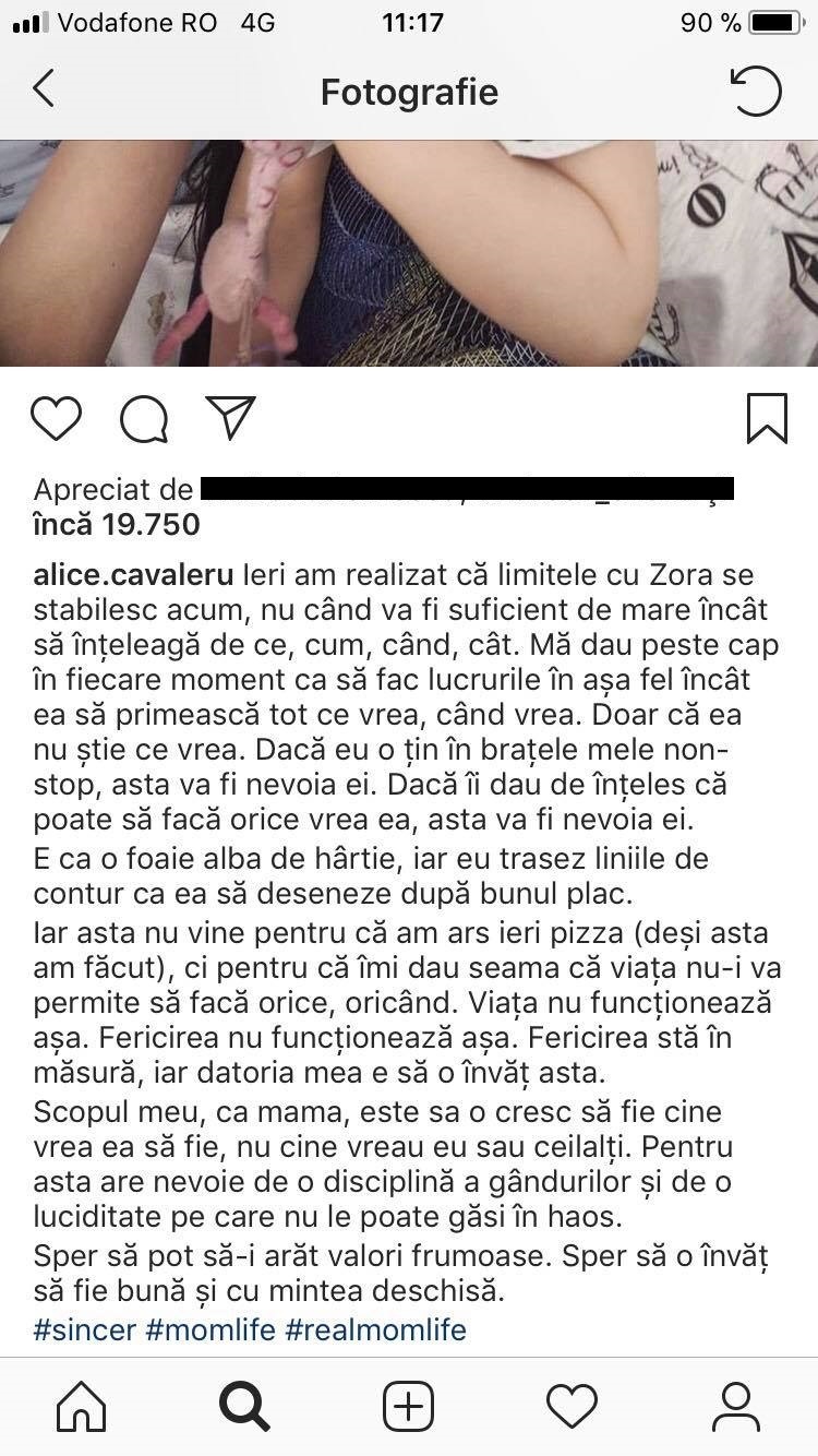 Mesajul lui Alice catre fiica ei a aparut pe contul ei de Instagram, strangand numeroase aprecieri si cuvinte de lauda din partea fanilor.