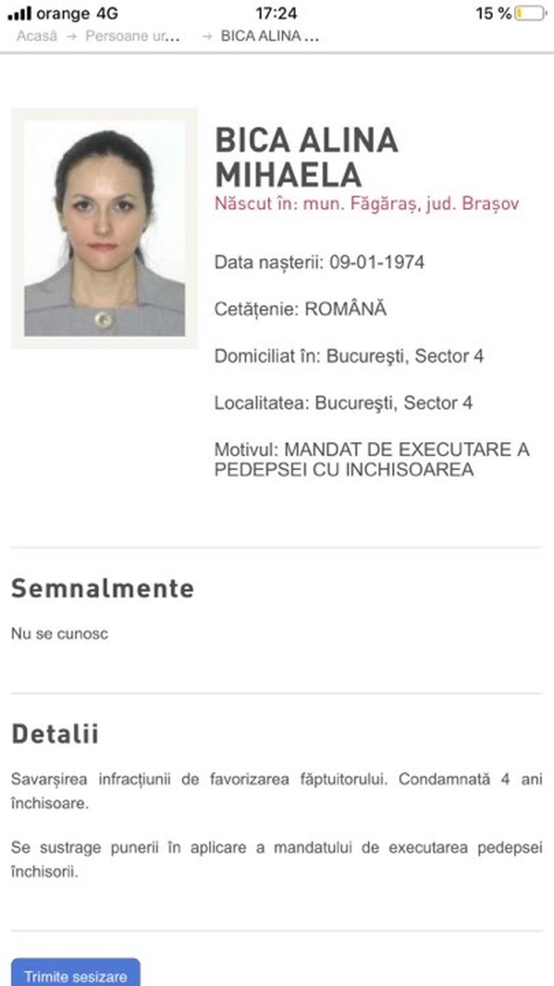 Poliţiştii precizează că Bica, născută în 1974 în Făgăraş, este urmărită pentru că se sustrage punerii în aplicare a mandatului de executare a închisorii, după ce a fost condamnată pentru săvârşirea infracţiunii de favorizarea făptuitorului.