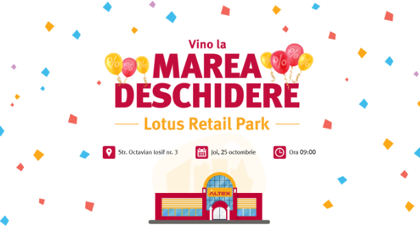 Noul magazin care se va deschide, în mai puţin de o săptămână, va oferi o gamă variată de produse şi preţuri foarte bune la zeci de mii de produse electronice şi electrocasnice, IT, comunicaţii, auto sau smart home. Vor fi prezente zeci de brand-uri cunoscute care vor fi anunţate printr-un catalog de oferte lansat special pentru deschiderea Altex Lotus Retail Park.