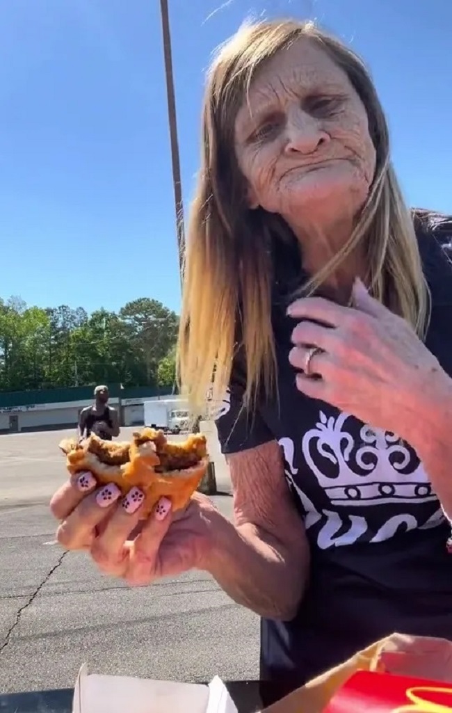 „Bine, acum o să-mi scot dinții ăștia ca să pot mânca”, spune femeia înainte de a lua o mușcătură uriașă dintr-un burger.
