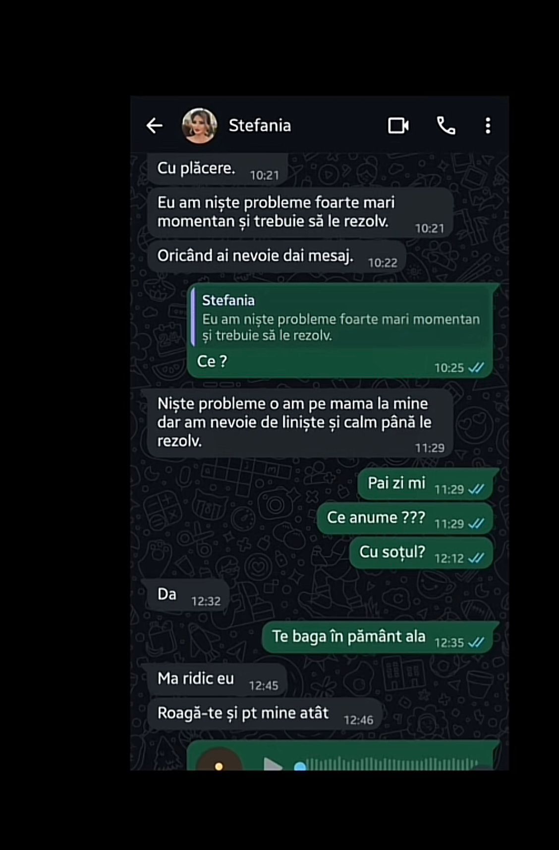 „Eu am niște probleme foarte mari momentan și trebuie să le rezolv. O am pe mama la mine, dar am nevoie de liniște și calm până le rezolv. ...cu soțul. Roagă-te pentru mine și atât.”, a mai spus Ștefania Szabo.