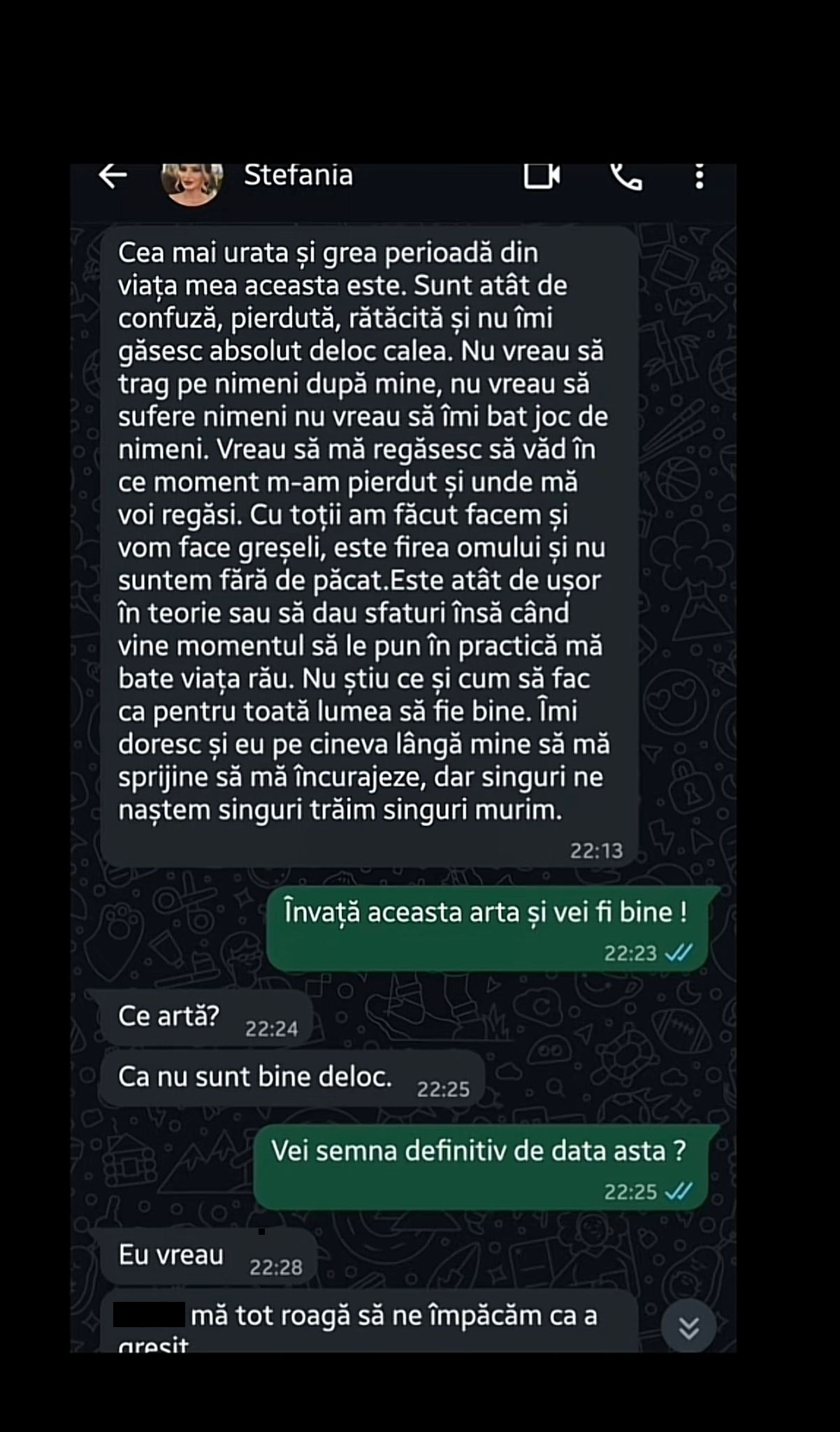 „Cea mai urâtă și grea perioadă din viața mea aceasta este. Sunt atât de confuză, pierdută și rătăcită și nu îmi găsesc deloc calea. Nu vreau să rănesc pe nimeni, nu vreau să sufere nimeni, nu vreau să îmi bat joc de nimeni. Vreau să mă regăsesc să văd în ce moment m-am pierdut și unde mă voi regăsi. Cu toții am făcut și facem și vom face greșeli, este firea omului și nu suntem fără de păcat. Este atât de ușor în teorie sau să dau sfaturi, însă când vine momentul să le pun în practică, mă bate viața rău. Nu știu ce și cum să fac ca pentru toată lumea să fie bine. Îmi doresc și eu pe cineva lângă mine să mă sprijine, să mă încurajeze, dar singuri ne naștem, singuri trăim, singuri murim. Sunt foarte tristă!”, este mesajul cutremurător pe care Ștefania Szabo l-a trimis fostului preot.