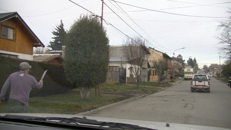 Intamplarea a avut loc in Argentina sambata in jurul orei 10 dimineata, cand temperatura de afara abia atingea sase grade. Barbatul care purta doar sosete si adidasi alerga pe strada, iar sotul furios venea amenintator din urma cu un cutit.