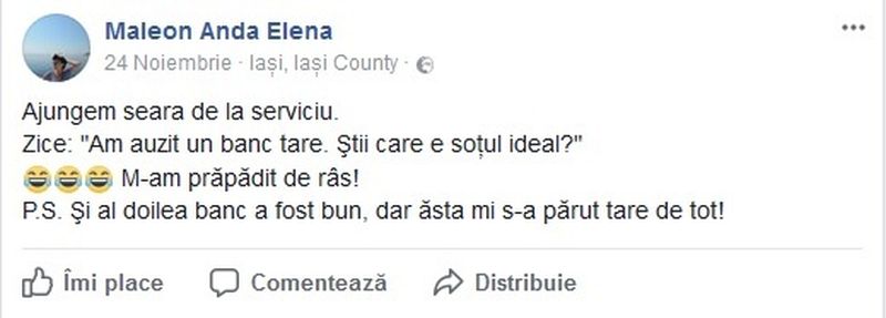 P.S. Şi al doilea banc a fost bun, dar ăsta mi s-a părut tare de tot!", mai scrie femeia.