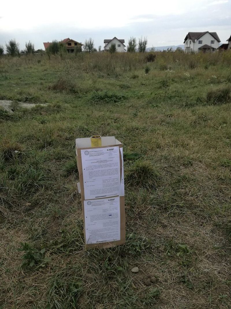 ANAF-ul vrea sa vanda un teren din Brasov cu un anunt situat in mijlocul campului, pe o cutie de carton.