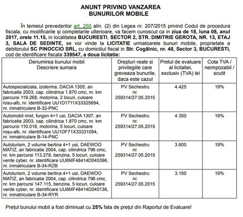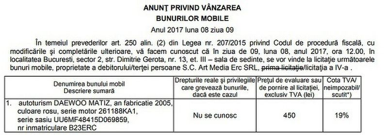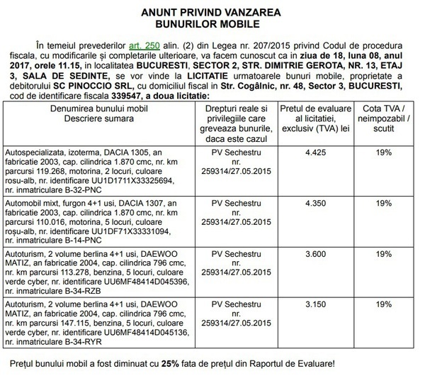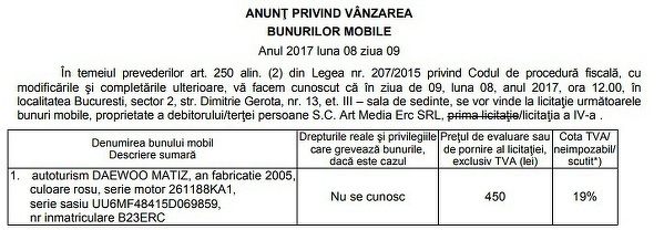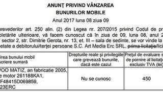 ANAF scoate la licitatie masinile unor firme cu probleme financiare. Preturile pentru luna iulie pornesc de la 450 de lei pentru un Matiz.