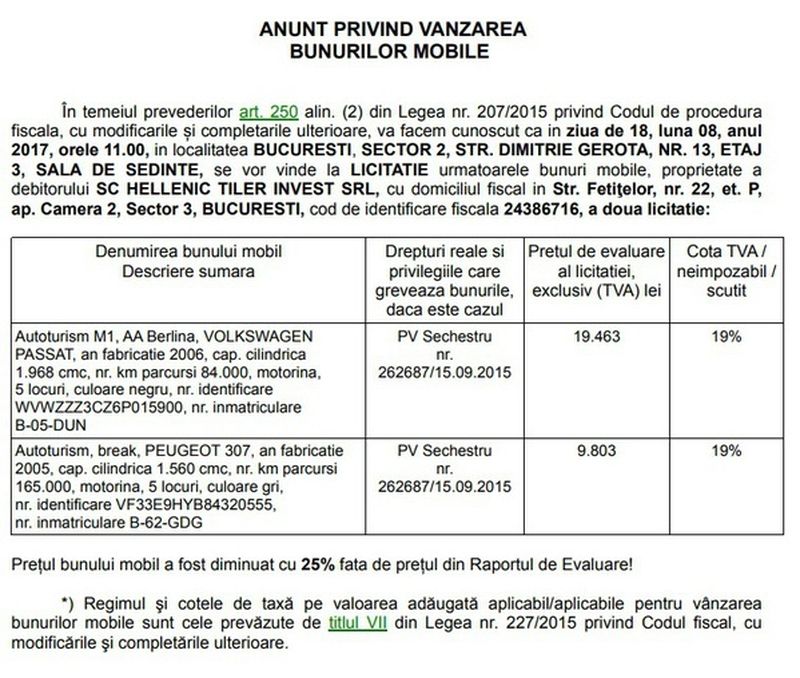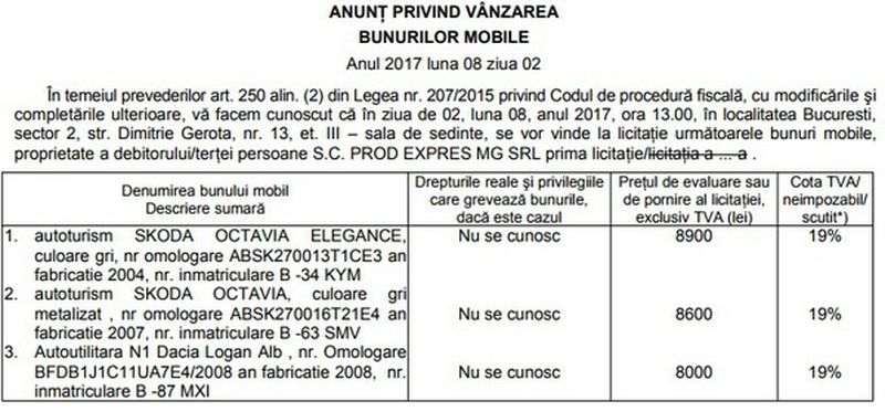 Prin intermediul rubricii "Anunturi" de pe site-ul propriu, ANAF anunta ca scoate la licitatie numeroase bunuri confiscate in ultima perioada de la persoane fizice sau de la firme, pe intreg teritoriul