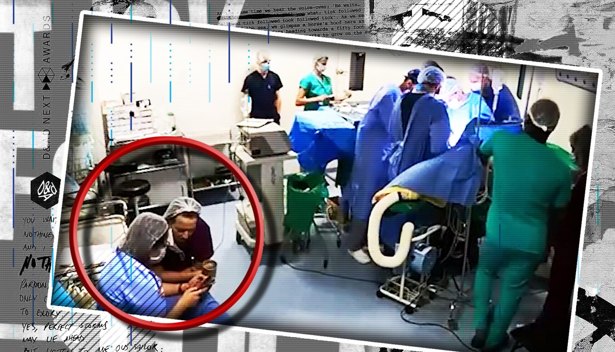 Aceasta bea cafea în sala de operații, chiar în timpul transplantului. Asistenta era alături de o colegă, care are mască chirurgicală, dar nu poartă mănuși sterile.