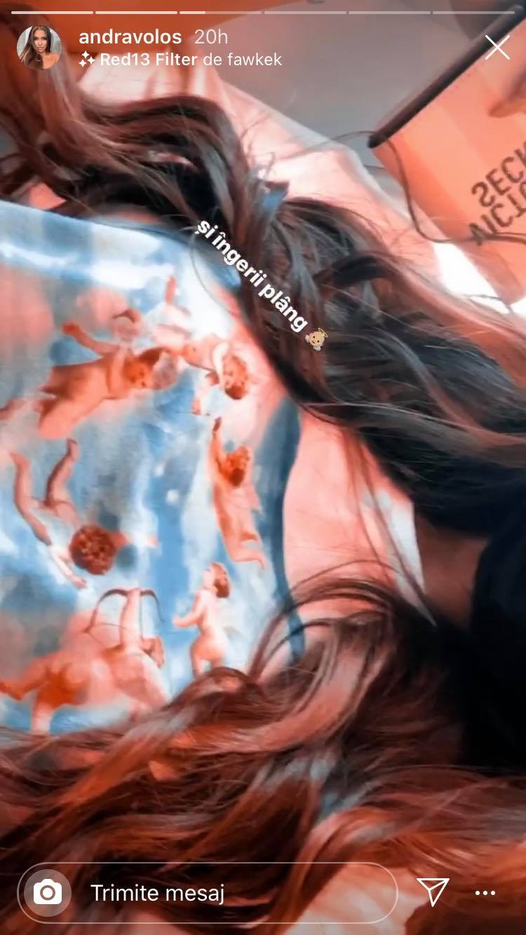 Pe drum, Andra Volos a adăugat: „ Și îngerii plâng. Știți vorba aia? Nu regreta niciodată alegerile pe care le faci. Eu regret azi că m-am dat cu rimel și nu am nici demachiant...”.