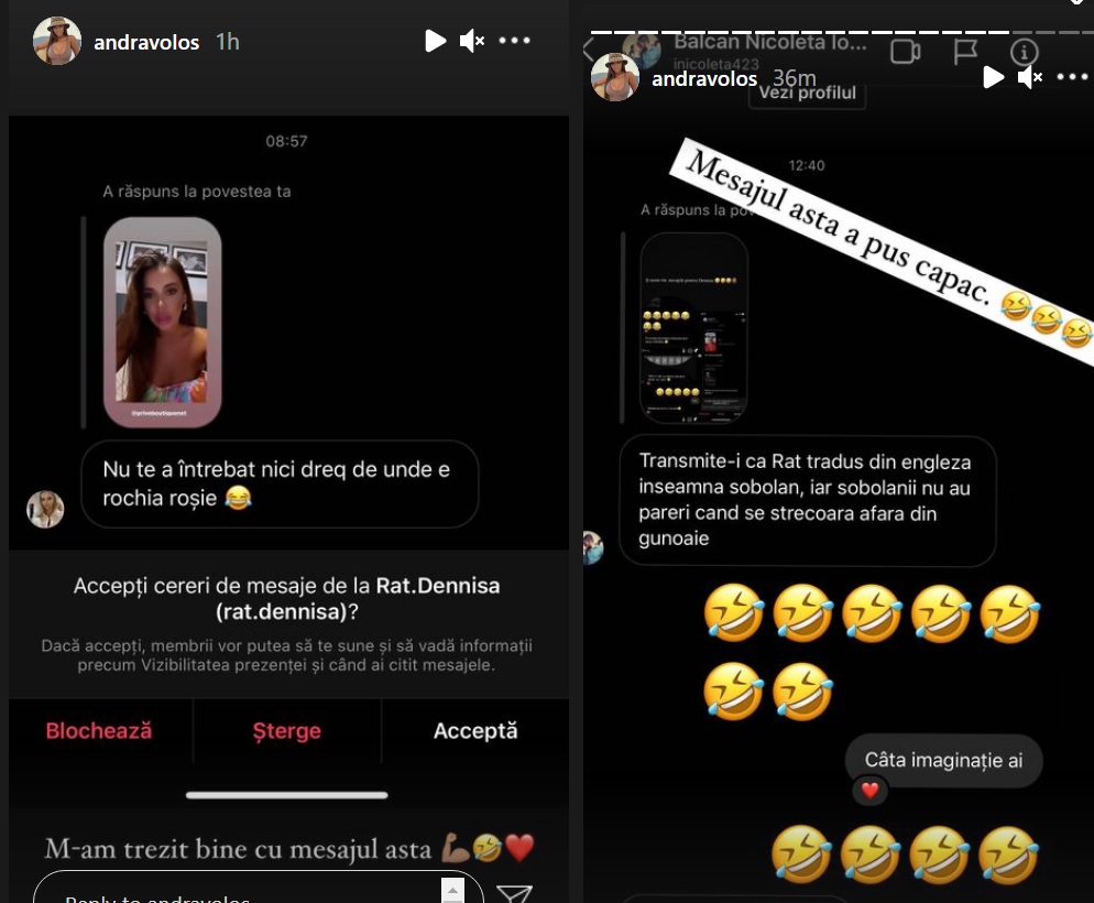 În loc să spună că nu este de acord cu astfel de jigniri, Andra Volos s-a amuzat de faptul că persoana care i-a scris a fost făcută șobolancă, iar f osta concurentă de la Puterea Dragostei nu s-a lăsat mai prejos și a încercat și ea să o atace pe tânăra care s-a luat de ea inițial, așa că a atacat-o cum a știut mai bine.