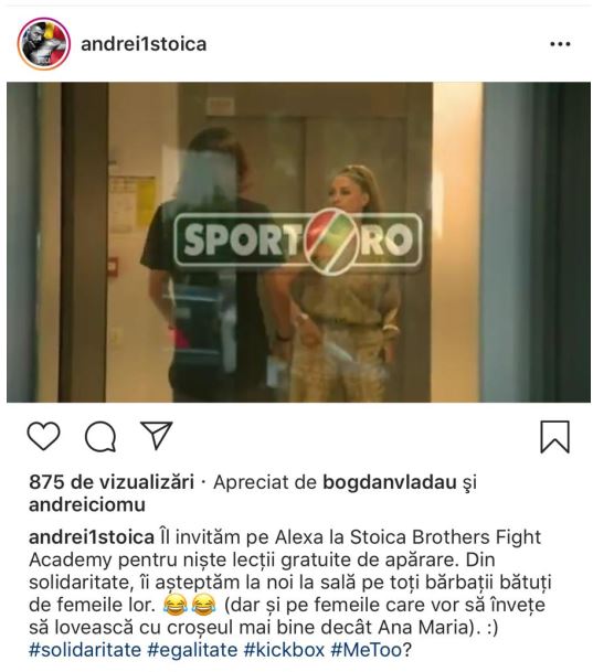 ”Îl invităm pe Alexa la Stoica Brothers Fight Academy pentru niște lecții gratuite de apărare. Din solidaritate, îi așteptăm la noi la sală pe toți bărbații bătuți de femeile lor. 😂😂 (dar și pe femeile care vor să învețe să lovească cu croșeul mai bine decât Ana Maria). 🙂 #solidaritate #egalitate #kickbox #MeToo?”, a scris Andrei Stoica pe Facebook.