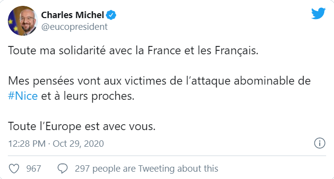 „Întreaga mea solidaritate cu Franţa şi cu francezii. Gândurile mele se îndreaptă către victimele atacului abominabil din Nisa şi către rudele lor. Întreaga Europă este cu voi”, a scris pe Twitter preşedintele Consiliului European, Charles Michel.