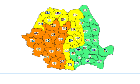 ”În Banat, Oltenia şi local la munte, în Transilvania şi Crişana vor fi perioade cu averse torenţiale, iar în intervale scurte de timp sau prin acumulare se vor înregistra cantităţi de apă de 40...60