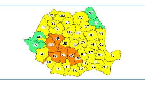 Codul portocaliu a fost emis pentru șase judeţe din nordul Olteniei, nord-vestul Munteniei şi sud-vestul Transilvaniei şi parţial judeţul Sibiu.