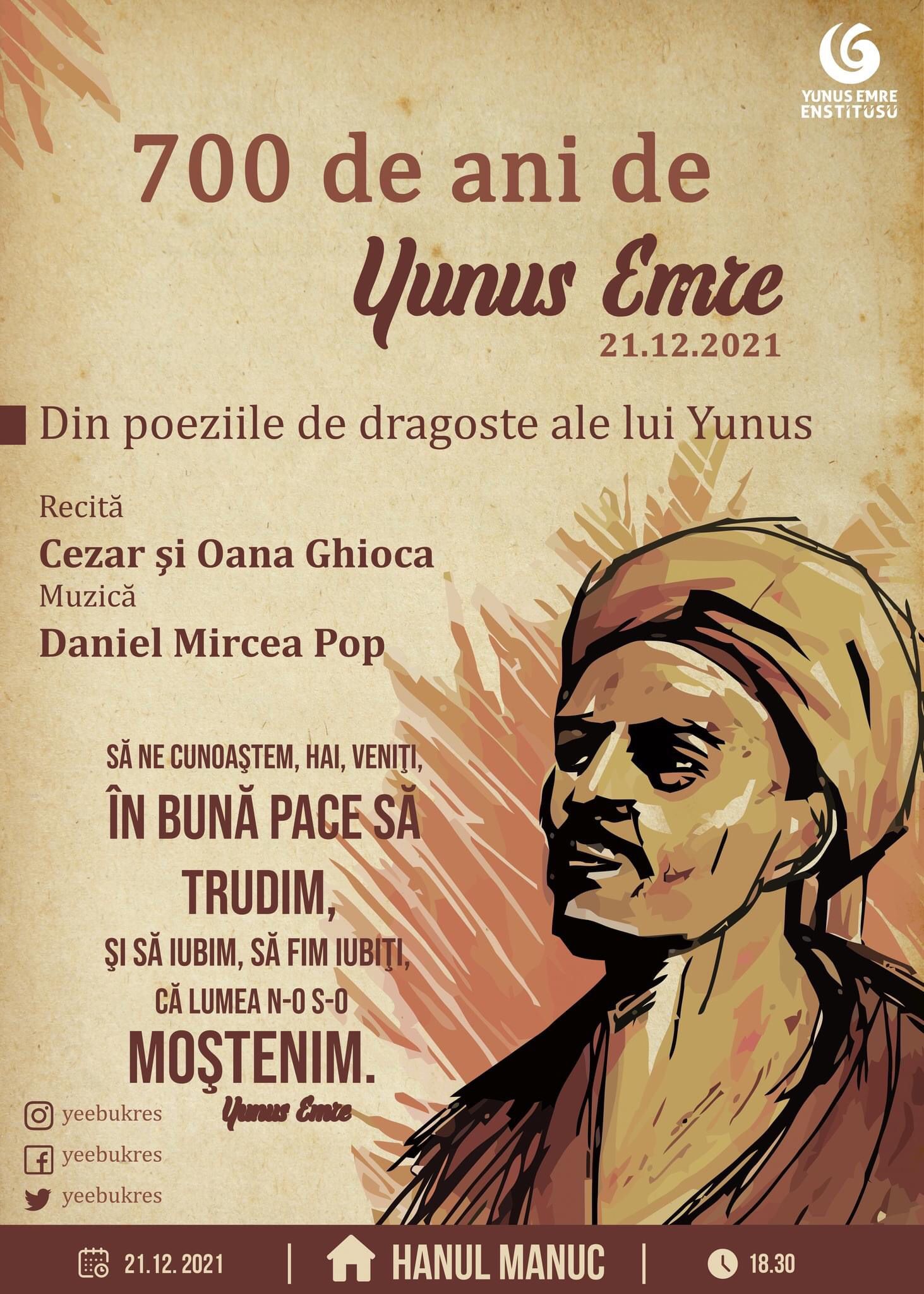 De asemenea, prin decizia Preşedinţiei Republicii Turcia 2021 a fost declarat „Anul Yunus Emre şi al Limbii Turce”. Cu ocazia acestei duble sărbători, va fi organizată o seară de poezie „Din poeziile de dragoste ale lui Yunus”, pe care am organizat-o pentru a comemora şi descoperi împreună în limba română pe una dintre cele mai importante personalităţi ale culturii şi limbii turce.