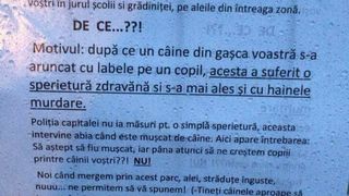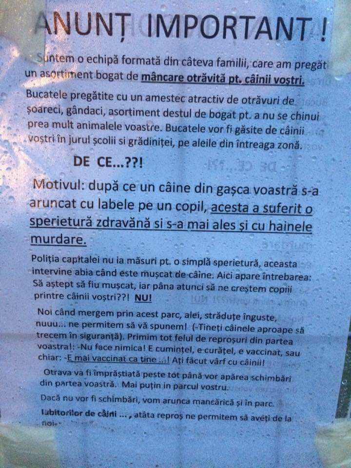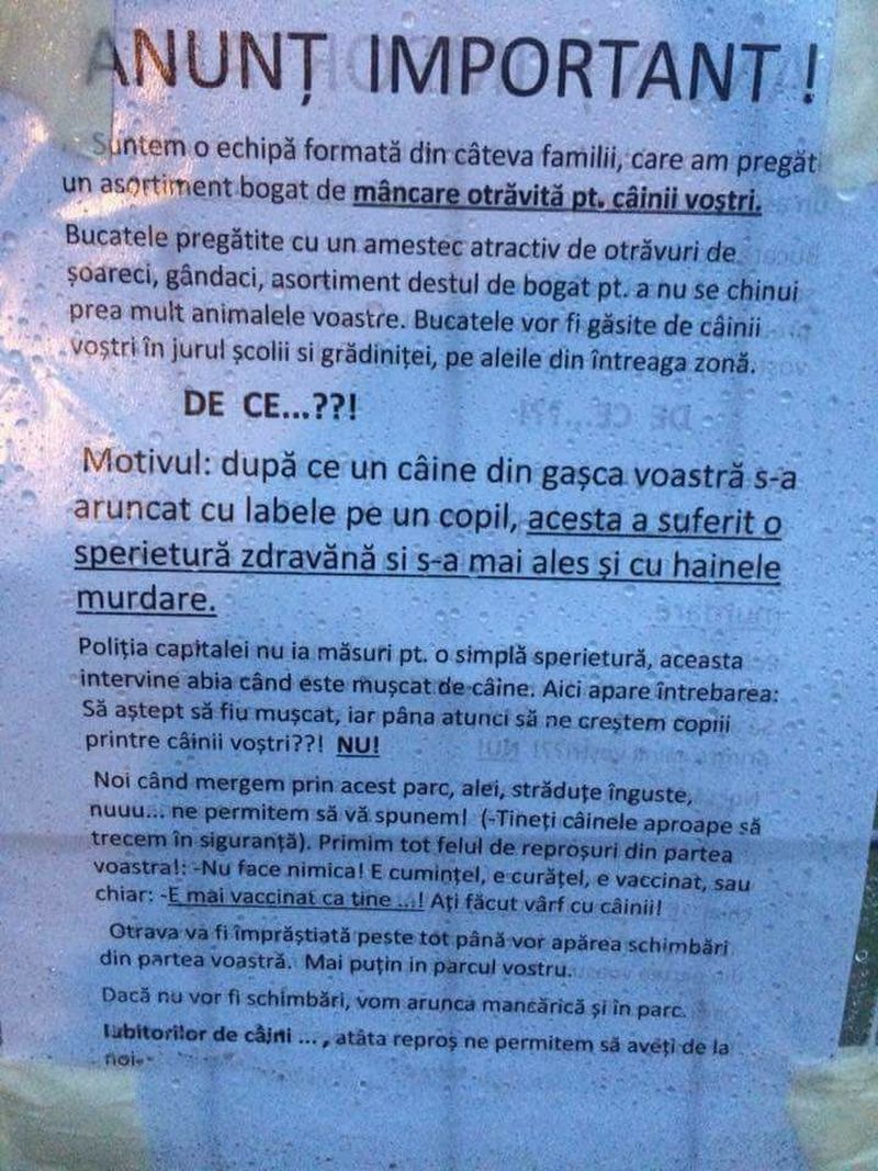 In apropierea Scolii Nr. 117 din Capitala a aparut un afis cu un mesaj halucinant. Mai multe familii care locuiesc in zona ii ameninta pe stapanii de caini ca le vor ucide animalele daca le prind in zona.