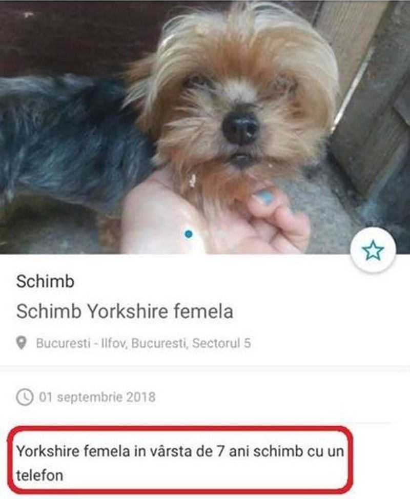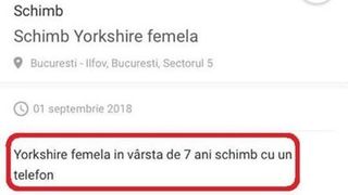 Anuntul este lipsit de detalii, dar sucient de clar: "Yorkshire femela in varsta de 7 ani schimb cu un telefon."