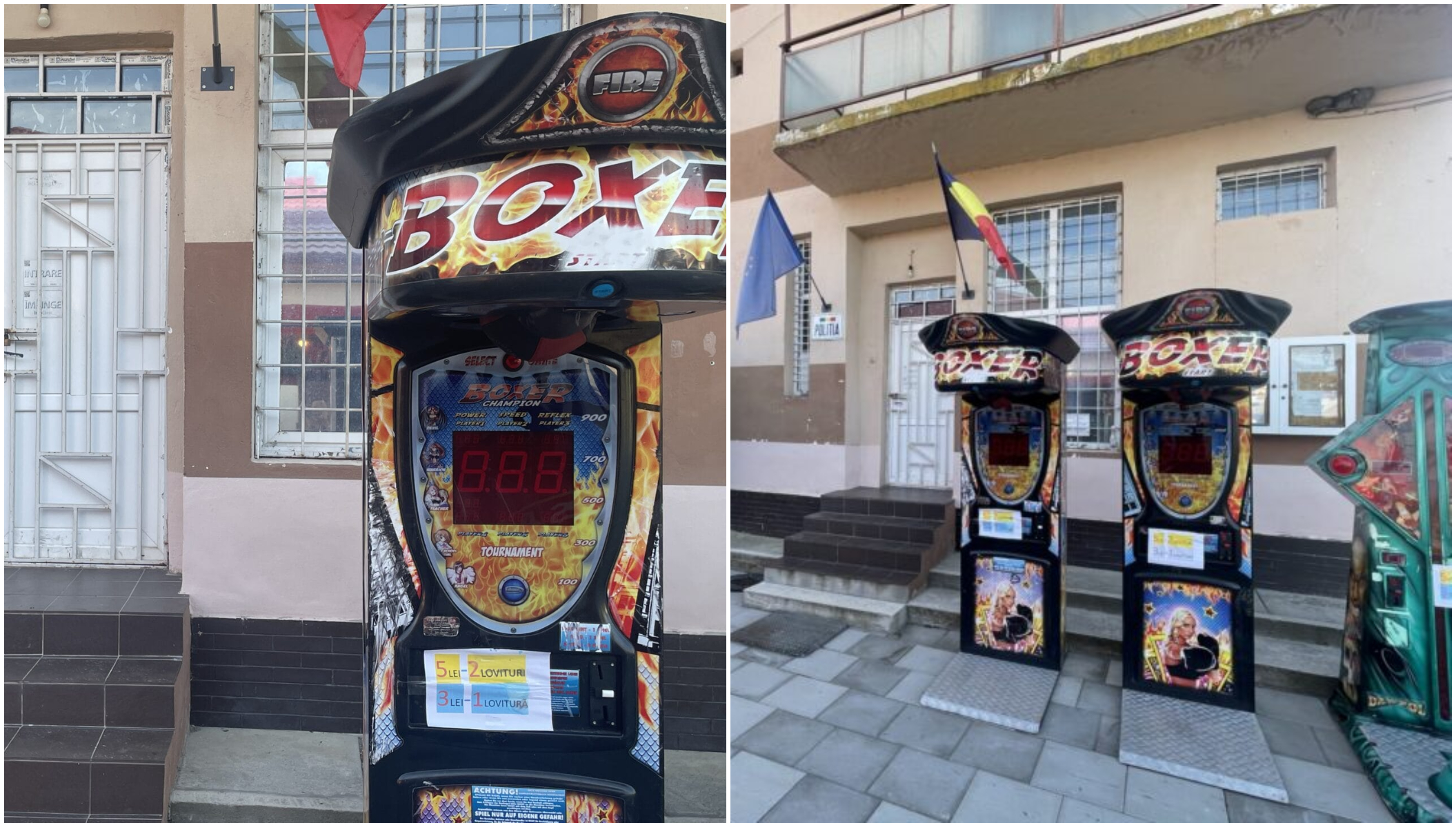 Trei aparate de box, destinate petrecăreților de la bâlci, au fost montate în fața intrării secției de Poliție din comuna Scoarța, Gorj pentru un eveniment care are loc astăzi.