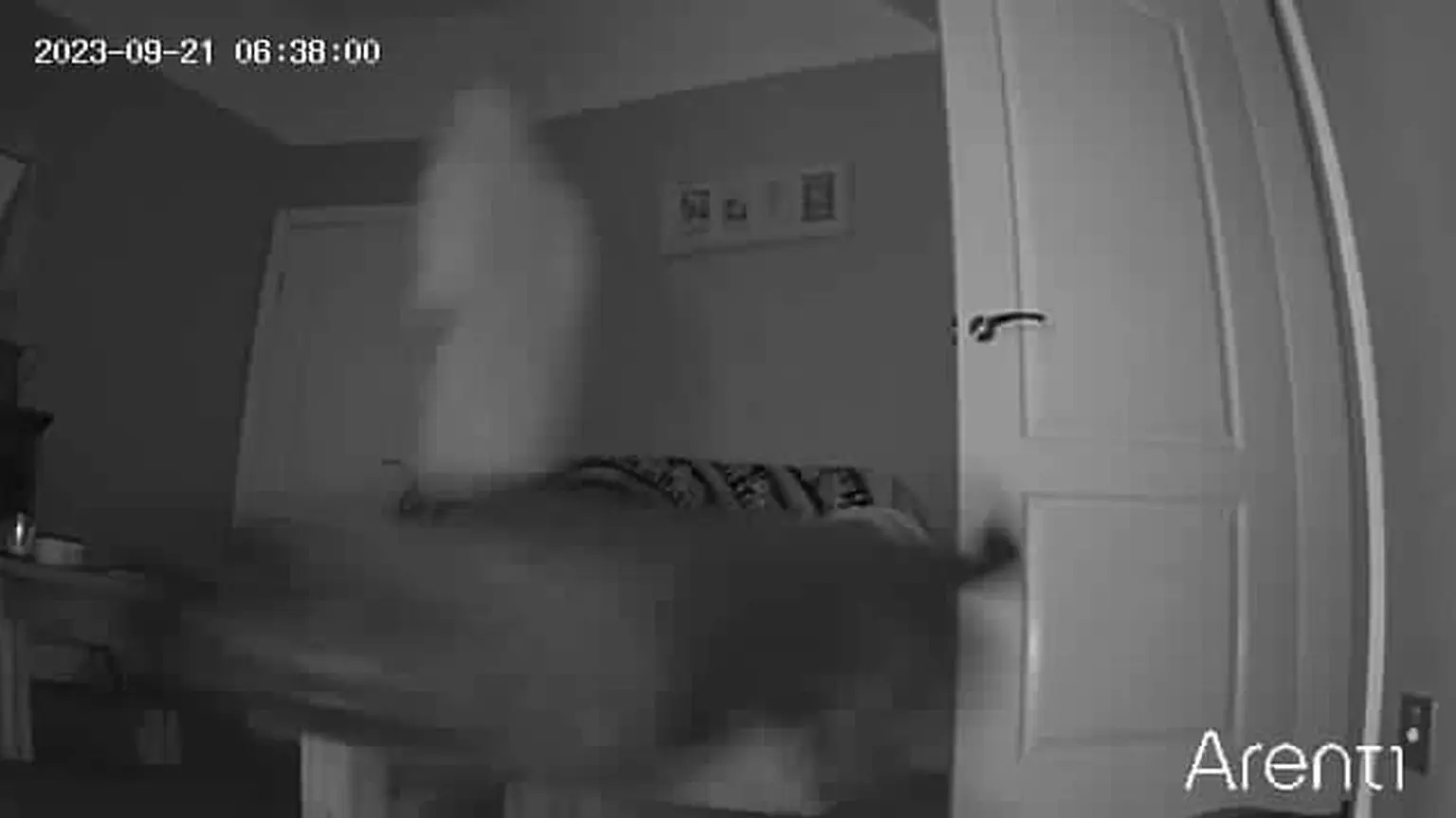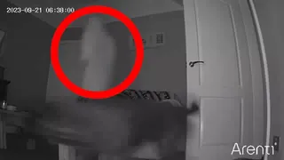 „Am fost puțin neliniștiți.”Camera de supraveghere a surprins câinele sărind departe de silueta „ciudată”, în timp ce aceasta plutea deasupra tocului ușii.