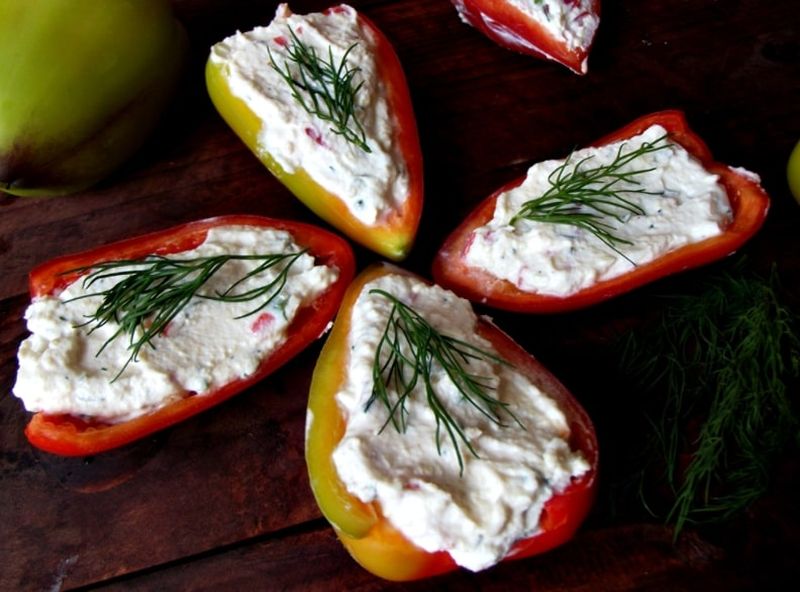 Tocam marunt un ardei rosu si ceapa verde si mararul si le adaugam in crema de ricotta. Asezonam cu sare si piper si omogenizam. Spalam ardeii si ii taiem in doua pe lungime. Indepartam cotorul. Dupa cre, umplem jumatatile de ardei cu crema de ricotta si decoram cu crengute de marar.