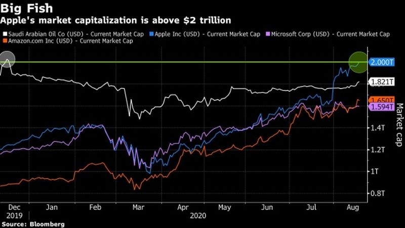 Câștigurile recente au consolidat poziția Apple ca fiind cea mai valoroasă companie din lume. În timp ce gigantul energetic Aramco a atins pentru o perioadă scurtă de timp evaluarea de 2 trilioane de dolari, în decembrie 2019, acțiunile companiei saudite au scăzut ulterior, iar în prezent valoarea de piață a ajuns la aproximativ 1,8 trilioane de dolari.